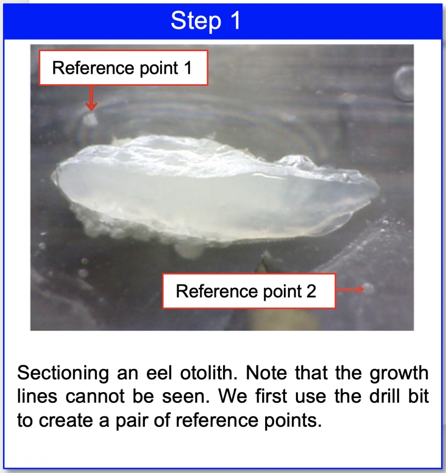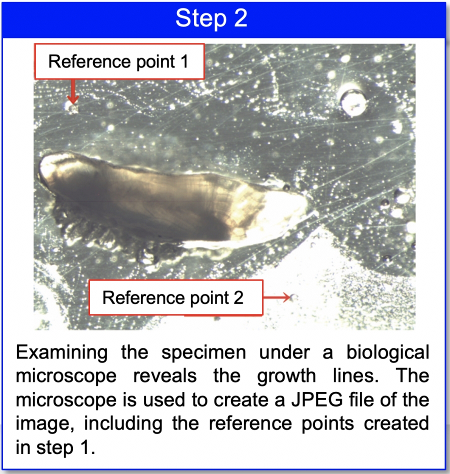 The images below show an example of sectioning an eel otolith. The photo in step 1 is the image as captured by Geomill326, and does not allow observation of the growth lines. As shown in step 2, however, using a high-luminescence biological microscope allows for easy observation of the growth lines.