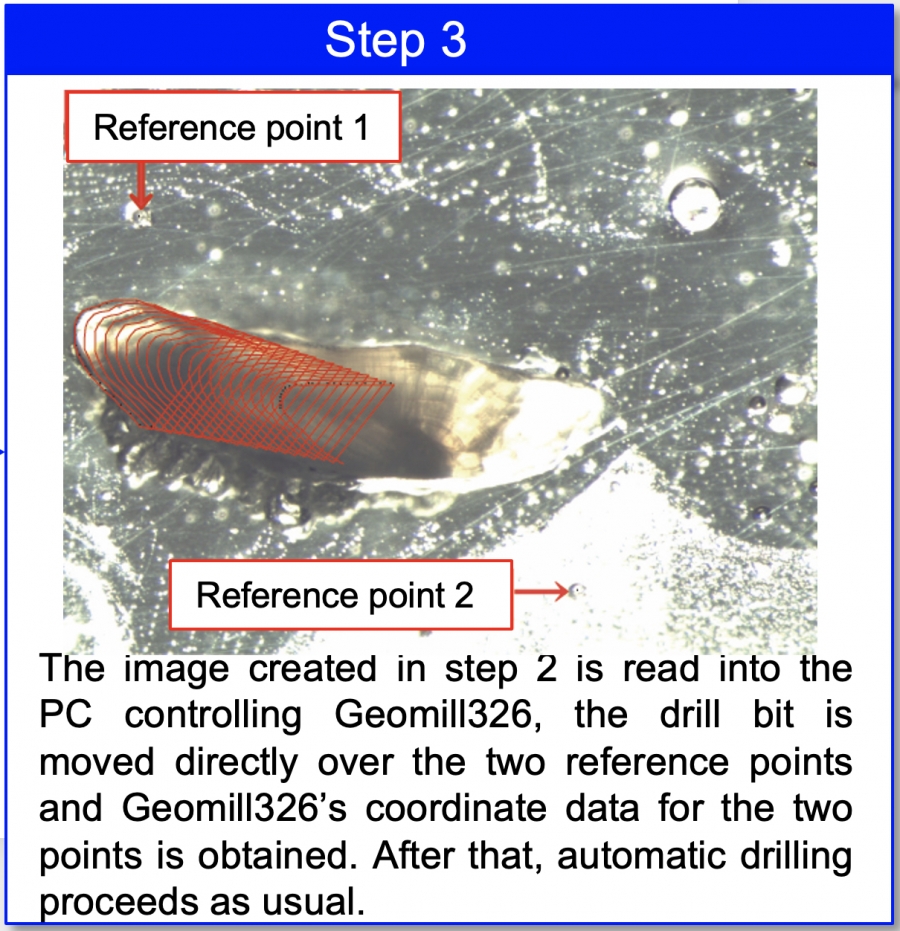 This is realized by using two reference points added to the drilling specimen on the automatic stage and two corresponding reference points on pixels in the image of the drilling specimen. Together, these can be used to guide drilling.