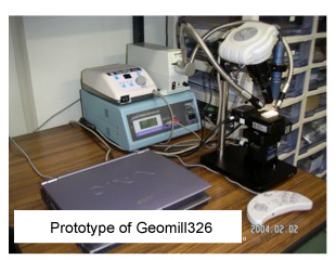 The GEOMILL326 set is comprised of: micro-drill, pedestal, CMOS cameras, lights and PC. Place the sample on the pedestal below the CMOS camera and observe on the PC monitor. For a more detailed view use the built-in zoom lens. If you specify the line to be cut on the screen, the coordinates are automatically changed. The drill is fixed; the base plate automatically moves along axis XYZ in 1μm increments for automatic precision cutting.