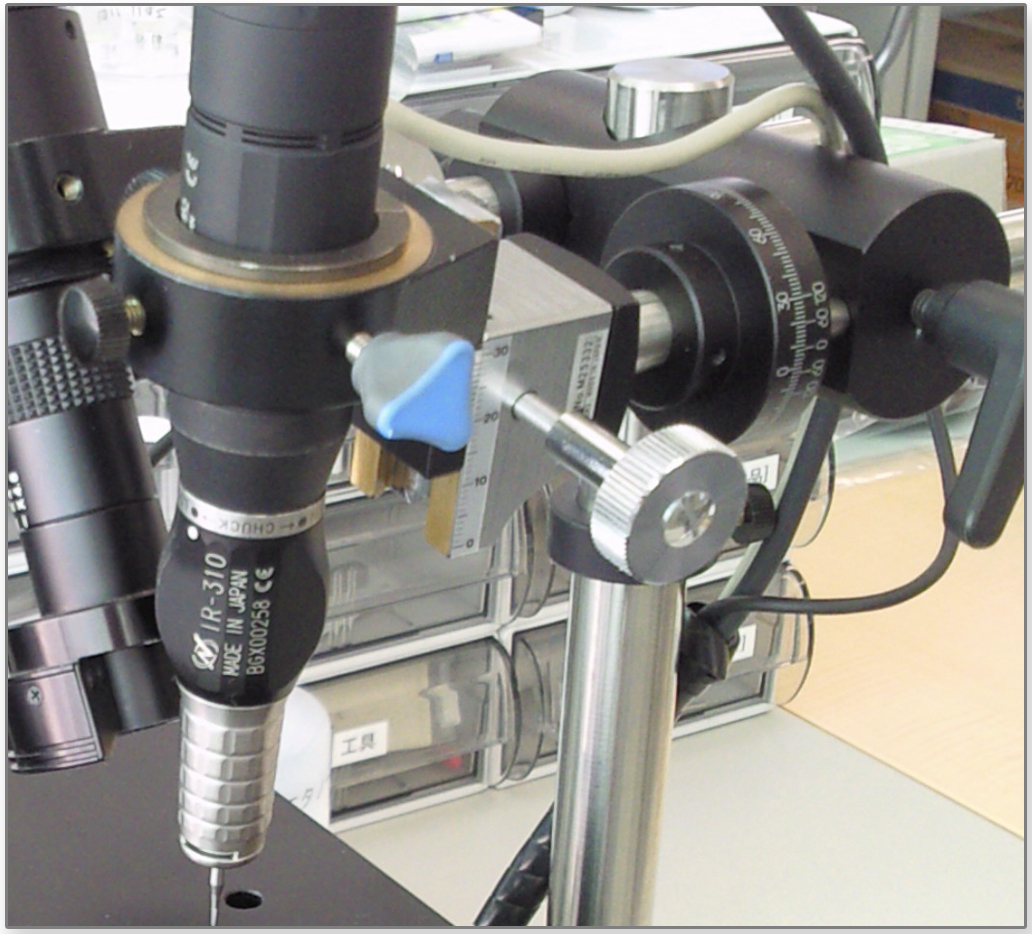 The angle of Geomill326's drill is adjustable. The drill angle display plate is a disk you can attach to the motor drill support pole which has an indicator for the drill attack angle. This display makes it easier to precisely adjust the drill to specific angles, or to find the angle perpendicular to the specimen surface.